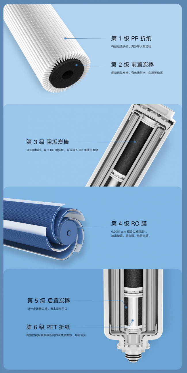 尽管减少了滤芯数量,但本产品的过滤层级反而有了提升——从此前的4级过滤升级到了6级过滤,也同样使用了RO反渗透技术,因此过滤效果是完全没有打折的,这都归功于新型设计的复合滤芯。