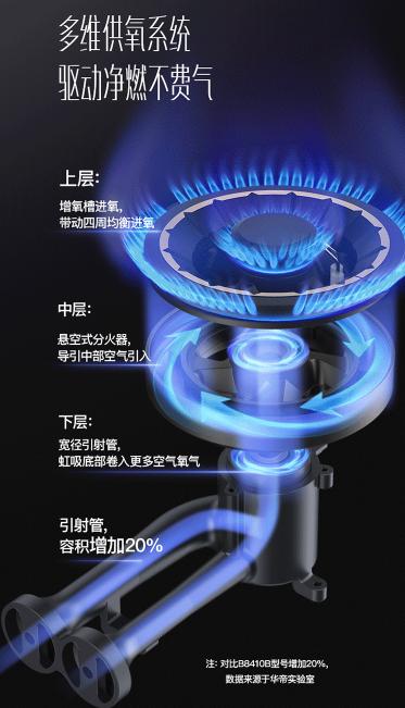 这款产品的热负荷指标能够超越传统产品,最主要的原因在于进一步提升了炉头的技术配置。其中,增设了内外火盖的火孔数量,多达124个出火孔,大大的扩大了火焰覆盖面积;同时,产品通过高空心率均衡供气舱,升级四通道供气模式,达到多倍猛火输送效果,大大提升了燃烧火力容量;另外,产品标配华帝燃气灶的多维立体供氧系统,改进了增氧槽、悬空式分氧器、宽径引射管等炉头炉具的设计,让产品的燃烧性能更高,自然火力更加猛烈。