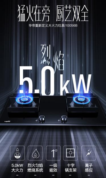 华帝新一代猛火灶i10056B型号最核心的卖点,就是高达5.0KW的猛烈大火力(同时产品的热效率同样高达63%),比较传统的4.5KW大火力灶标准,火力燃烧性能更加卓越。