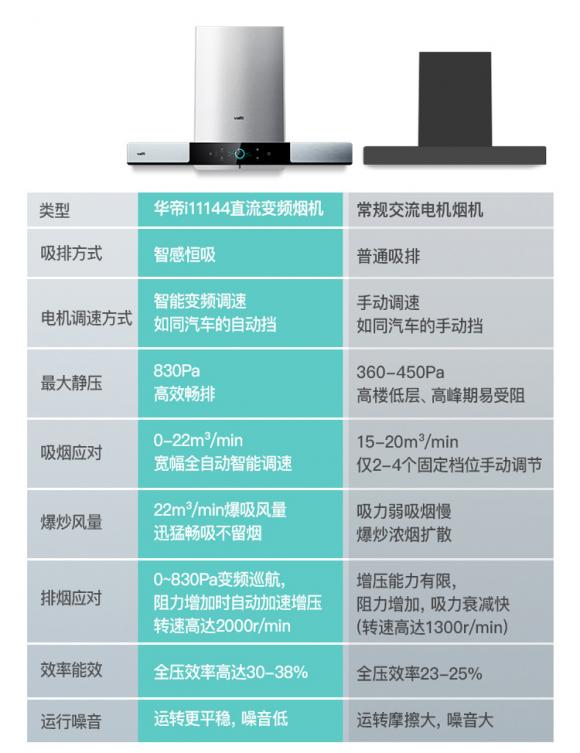 作为一款直流变频油烟机,产品在吸排方式、电机调速方式、最大风量、最大风压、效率能效、运行噪音等方面,比较传统的交流电机油烟机,均具有无可比拟的优势。