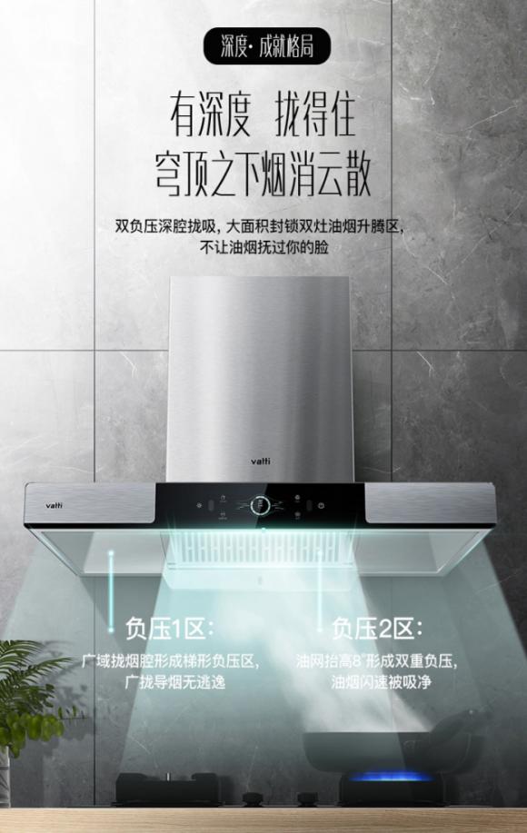 从工业设计方面看,作为一款T型油烟机,这款产品最大的特点,是具有双重负压的拢烟腔设计。广域拢烟腔和第三代立体油网技术,让产品形成不一样的深腔拢吸性能,能够大面积的封锁双眼灶的油网升腾区,不让油烟爬上你的脸。