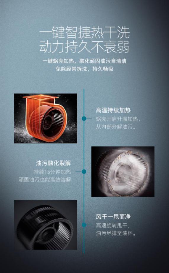 你还在为拆卸清洗烟机而烦恼?索奇L310烟机,攻克家庭烟机清洗难题。一键智捷热干洗,动力持久不衰弱。无需加水,无需拆洗,用户一键启动清洗键。烟机通过发热丝将蜗壳加热至80℃,持续15分钟的高温,将风轮及藏匿在烟机内部的油污,软化成为液体流入油杯。