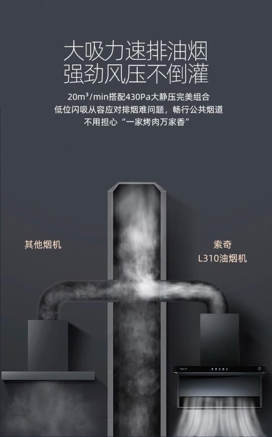 作为中国厨房电器十大品牌,索奇推出的L310烟机。除了清洁和智能方面的贴心设计,吸力这方面也是值得大家所关注的。它采用低位进风口设计,吸力下潜,顶侧双擎。二合一全方位围剿油烟防止油烟逃逸,高效净烟保持厨房洁净。而烟机净烟效果,主要看两个因素:排风量和风压。索奇L310烟机排风量最高可达20m³/min搭配430Pa超大静压完美组合,从容应对排烟难的问题,油烟不倒灌!
