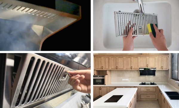 最后来验证一下清洗油网的便捷性,此款产品的油网设计是两段式的,并且没有用螺丝固定,拉起中间的拨片向上一提立刻就拆了下来,除了可以放入普通的双槽洗碗池内进行清洗。测评者将油网放到洗碗机里试了试,居然也能放进去。由此看的出设计师的匠心所在。