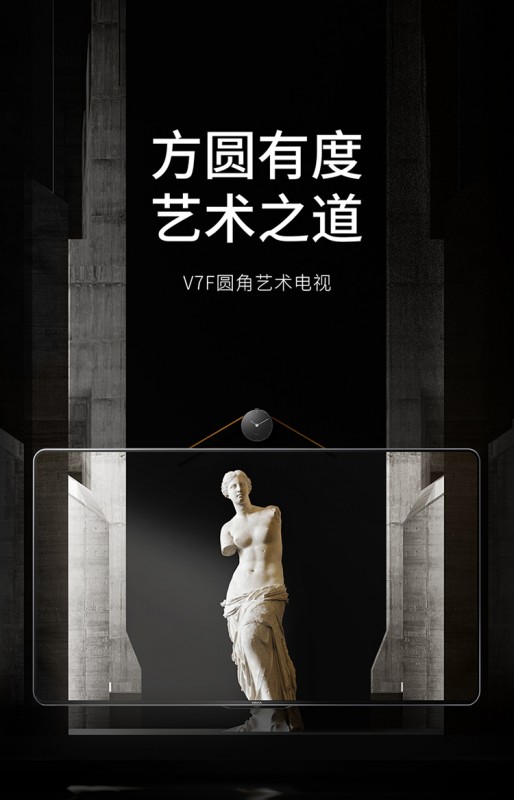 VIDAA圆角电视 V7F,这款电视最令人惊艳的就是它艺术性的外观。V7F是首款壁挂式纯平背板的AI电视,它打破了传统电视的常规保守设计,整机圆角半径为35.6mm设计凝心匠造圆润镜面屏,四边无边视觉体验,做到情融于景,打造沉浸美感。摆在家里,它既是一款拥有超清画质和强大智能功能的电视,也是一件凸显品味的家居美学艺术品。