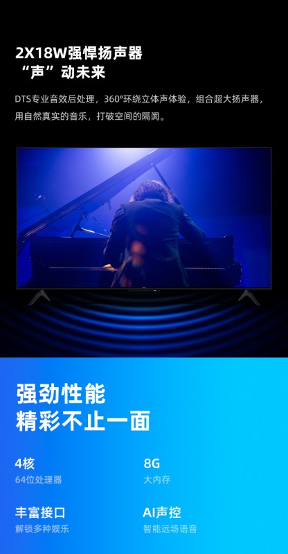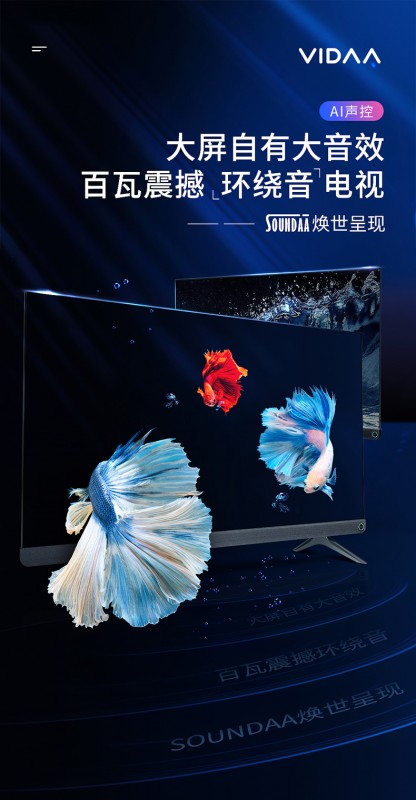 VIDAA百瓦音响电视 V1F-PRO。它采用无边框全面屏纤薄机身设计,除了拥有超画质引擎、高性能64位处理器、 AI智慧系统等高端配置外, V1F-PRO最出彩的便是它的顶级音质效果。V1F-PRO电视搭载了Soundaa百瓦音响,内置6单元澎湃扬声器,1.4L大腔体,独立高频,声音细腻清脆,可打破空间隔阂实现全场景智能声环绕,让人在观看电视的过程中感受到音画合一的强悍影院级视听享受。