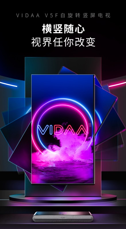 VIDAA自旋转竖屏电视 V5F。旋转电视是今年的热点产品,这款V5F采用黑科技旋转挂架,配置加速度传感器与陀螺仪,使用时可通过AI语音智能控制随心实现90°精准电动旋转,横屏竖屏由你定义。用户可以将手机上的抖音快手短视频、微博、小说、漫画等内容投屏到V5F电视上,通过竖屏展示获得更舒适护眼、趣味个性的大屏观看体验。