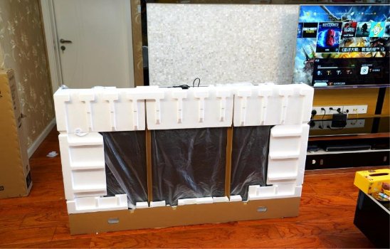 安装完成,先与老电视来张对比吧。不对比不知道,一对比才发现65英寸比55英寸真的是大了不少啊,这个尺寸虽然还没开机就已经觉得很“爽”了!要不是电视墙不合适,楼主是想直接上85英寸呢