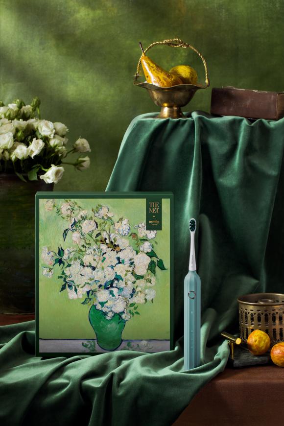 除此之外,牙刷的外包装也致敬馆藏珍品做了深度设计。比如上图中的“梵高绿”,致敬了梵高在1889年所画的《玫瑰》。usmile和大都会艺术博物馆都期待,将画作的艺术冲击,同梵高炽热的情感一起被人所感知。