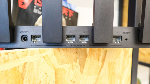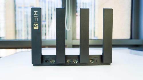 来到背面,华为路由AX3 Pro天线上同样有着暗金色的Wi-Fi 6+的字样。四根配有信号放大器的天线连接就在这里。所以,比起市面上同价位的其他路由器品牌,华为路由AX3信号更好。