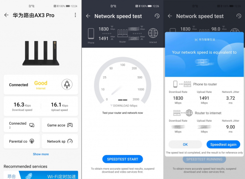 于是,小编赶紧测了测华为路由AX3 Pro的网速。不得不说,加入了Wi-Fi 6+技术,网速真的有种“飞起来”的感觉!从上图能看到:华为P40 Pro和华为路由AX3 Pro之间的网速竟然达到了千兆级别,下行1830Mbps/上行1491Mbps,真是太强大了!