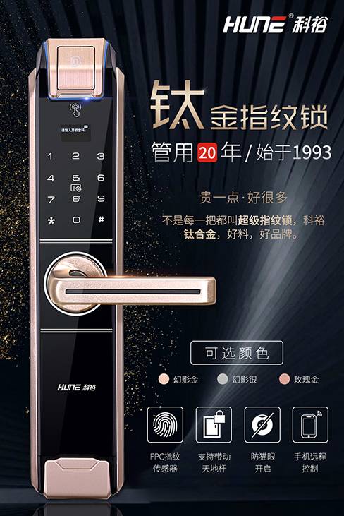 目前智能锁的指纹头主要有两种类型:光学指纹头和半导体指纹头。光学指纹头容易被复制,造成安全隐患,半导体指纹头安全性较高,一般不容易被复制。科裕智能锁采用瑞典FPC纳米陶瓷指纹头,使用活体生物技术,越使用越灵活,0.3s识别,一触即开。