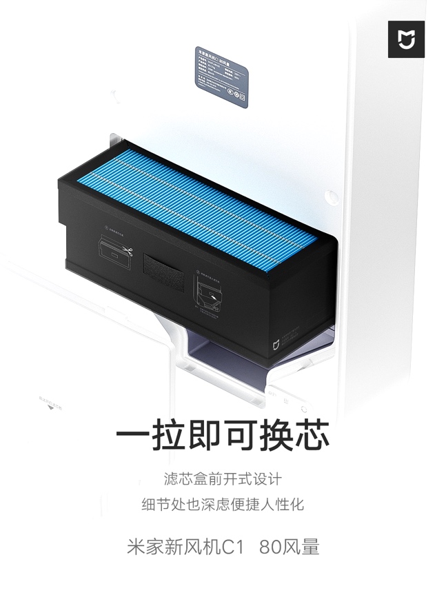 米家新风机C1内置复合滤芯使用HEPA13级高效滤材,可层层过滤常见的柳絮、花粉、二手烟、毛发、沙尘、细屑等污染物。初效滤网可拆卸、可清洗,阻隔蚊虫、柳絮等污染物。中效滤网充分过滤PM10、沙尘等空气中较大的颗粒物,并能有效过滤PM2.5,提升高效滤网的净化效果。高效滤网继续深度净化,充分过滤PM2.5及花粉等可吸入颗粒物,并能高效过滤粒径0.3μm、0.1μm颗粒物等。