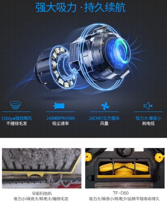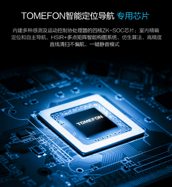 斐纳TOMEFON-TF-D60扫地机器人全新升级的3.0规划清洁时代,让我们彻底告别扫地机乱跑乱撞的清洁时代。通过所搭载的斐纳TOMEFON智能专用芯片,能对全屋进行高精度定位和自主导航,再根据智能构图系统的地图测绘,实时建立精准的家居地图,让机器人清扫有目标不乱撞,并且通过仿生算法法则进行自主推算室内分区方案,实现科学高效的清扫路径让全屋覆盖率增高。