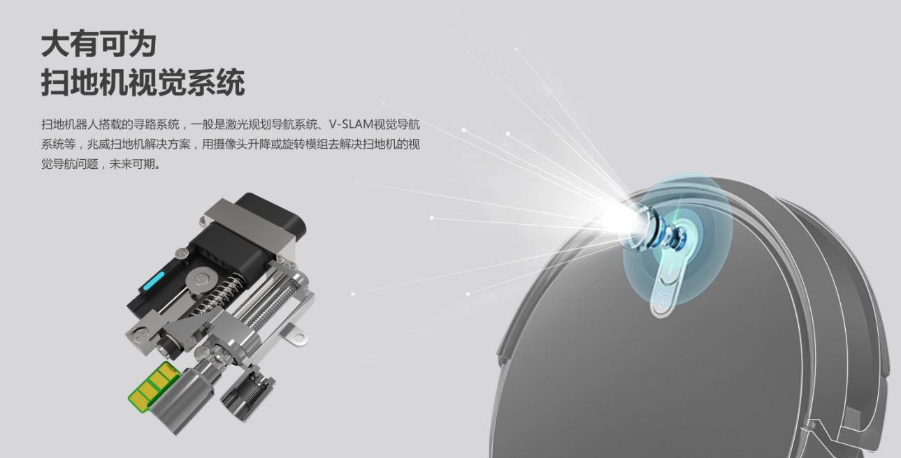 扫地机技术创新,需要企业的通观全局、需要对消费者的责任心、需要系统的能力支撑。扫地机器人搭载的寻路系统,一般是激光规划导航系统、V-SLAM视觉导航系统等,兆威扫地机解决方案,用摄像头升降或旋转模组去解决扫地机的视觉导航问题,未来可期。未来有“眼睛”的且价廉的扫地机 让家务更简单。