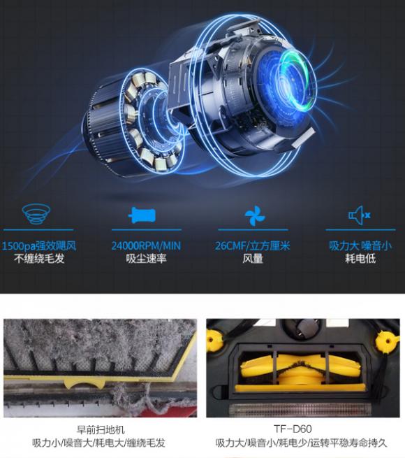 而独家配备的吸力大但噪音小的斐纳TOMEFON无刷电机,强效飓风般的吸力能通过变频吸口的设计让毛发畅吸不缠绕,还能根据周围环境和探测到情况来自动调整清洁销量和风力大小。清扫有针对性,除尘更容易。