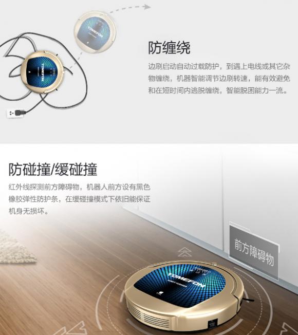 为规避清扫途中的安全问题,斐纳TOMEFON-TF-D60扫地机器人在底部装有智能防跌落红外感应电子眼,可在探测到5cm以上的落差时及时掉头,在前方则设有黑色橡胶弹性防护条,可以保证在发生碰撞的情况下机身依旧无损坏。甚至在遇到电线缠绕时还能启动自动过载防护,确保能在最短时间内逃脱,智能脱困能力实属一流。