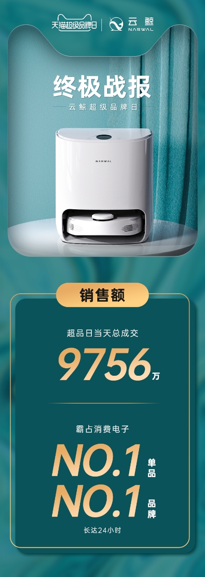 云鲸是首个上市不到一年就登陆天猫超级品牌日的国货品牌。重磅登录天猫品牌日,云鲸向消费者展示了品牌的身份与内核,通过一系列线上线下联动与数字赋能,打通全渠道,开启品牌的营销创新。这次活动再次刷新了“小白鲸”营销和销售史上的“奇迹”。本次活动自7月开始在抖音、小红书、微博这三个大流量池预热,进入8月,云鲸天猫旗舰店正式推出1元购买200元优惠券活动,同时在微博、抖音、小红书平台加大曝光,活动初期阅读量达3000万,留言互动达4万余条。后期刘涛和@野生珍妮、@除了我都是猪(张可)的加入,更是掀起流量热潮。在云鲸X天猫超品日活动上,“小白鲸”上线5分钟销售额突破5000万,当天总销售额近亿,创造上市一年内的历史新高,并刷新了小家电天猫超品日的销售额纪录,展现出云鲸品牌和产品的无限潜力。