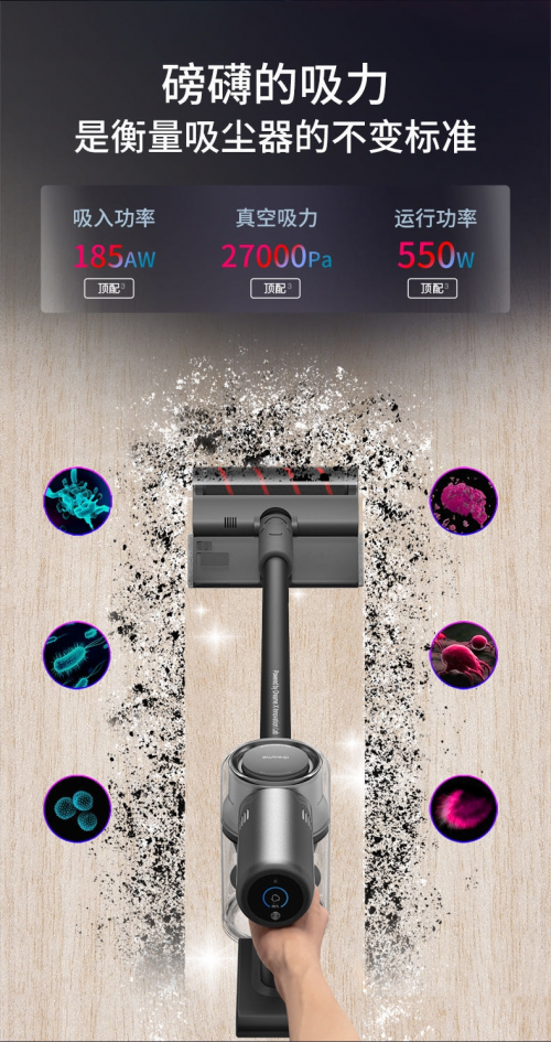 这款吸尘器也是当前全球唯一一款可实现量产并将马达转速提升至15万转/分钟的无线吸尘器,提供185AW强劲吸力,同时在此基础上,整机风道、电流、过滤系统进行整体协同优化,横扫地板缝隙、死角处的深层污垢。