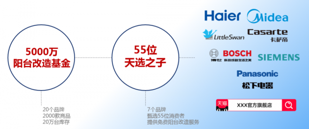 此外,天猫还将联合博世、海尔、卡萨帝,美的、松下、西门子、小天鹅7大品牌,甄选55位幸运消费者,上门提供阳台改造服务。
