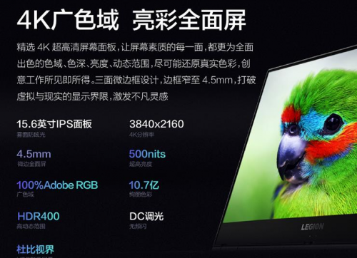 Y9000X最高配备了15.6英寸的大尺度4K屏,拥有100% Adobe RGB色域,具备10.7亿的色彩,色彩显示极致精准。经过VESA DisplayHDR 400认证,支持杜比视界,亮度达到500nit,让画面清晰细腻,还原真实色彩。显示屏支持180°的开合,配合超大的可视角度,方便用户在更多场景中应用。