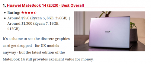 最后,Dominic Preston在总结中提到,在2020年MateBook 14锐龙版中,华为再一次超越期待——设计精巧,时尚,简洁,并配有出色的显示屏和丰富端口,以及强劲的续航表现,这款足以称为“全能”的产品,无愧为本次横评的冠军,荣获“Best Overall”的称号。