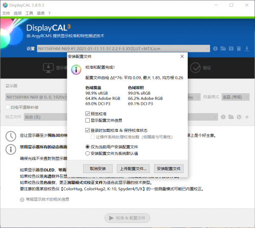 屏幕方面,小新15 2021搭载了一块15.6英寸IPS雾面防眩光屏幕,分辨率1920x1080分辨率,100% sRGB色域,300尼特亮度,屏幕支持DC调光。实测色域表现和标称值基本一直,可以看到色域覆盖和色域容积的差值并不大,说明这块屏幕的色准还是很不错的,用来处理一下PS之类的图形工作也是挺不错的。