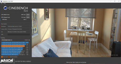 CINEBENCH R23多核得分4984pts,单核得分1312pts。单核心得分甚至比频率几乎高1倍的7700K还要高不少。