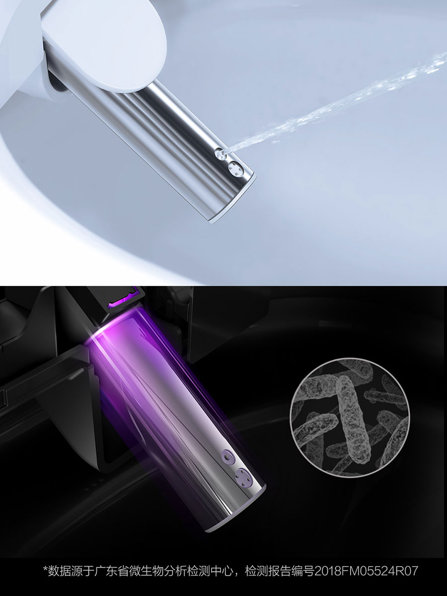 智米智能马桶盖的喷嘴具备双重自洁功能。冲洗钱,环状水流会全面清洗喷嘴;离座后,紫外线则会高效灭除喷嘴上的细菌,灭菌率达到99%。